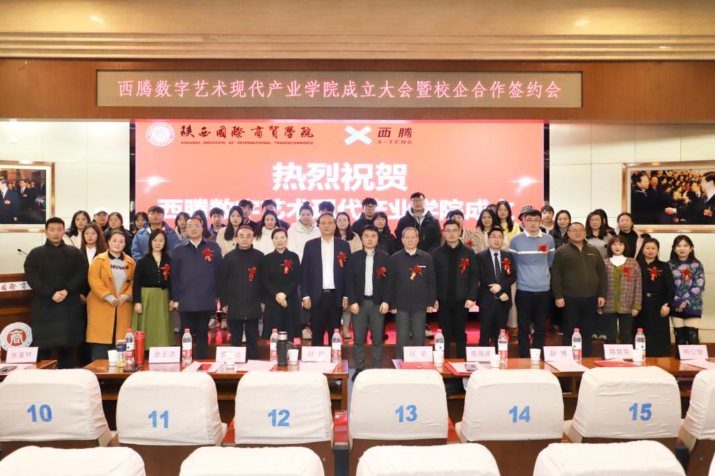 为进一步贯彻落实《国务院办公厅关于深化产教融合的若干意见》及陕西省教育厅办公室《关于开展未来技术学院、现代产业学院申报与建设工作的通知》等文件精神,更好的提升学校与区域经济的融合度,12月14日下午,陕西国际商贸学院西腾数字艺术现代产业学院成立大会暨校企合作签约会在学术报告厅二楼隆重举行,西安西腾产业投资管理有限公司执行董事程梁、腾讯集团公共事务西北区域负责人董海波、阅文集团合作伙伴代表易旻昊、西安西腾产业投资管理有限公司教育板块负责人赵博、西安西腾产业投资管理有限公司教育板块熊心怡、西安西腾产业投资管理有限公司政策研究部负责人梁媛媛、QY球友会网站董事长、校长赵超,董事张玉洁,执行校长贾明远、副校长张富林、校长助理王文博、教务处相关负责人以及qy球友会体育官网师生代表参加了会议。会议由qy球友会体育官网院长曲梅主持。