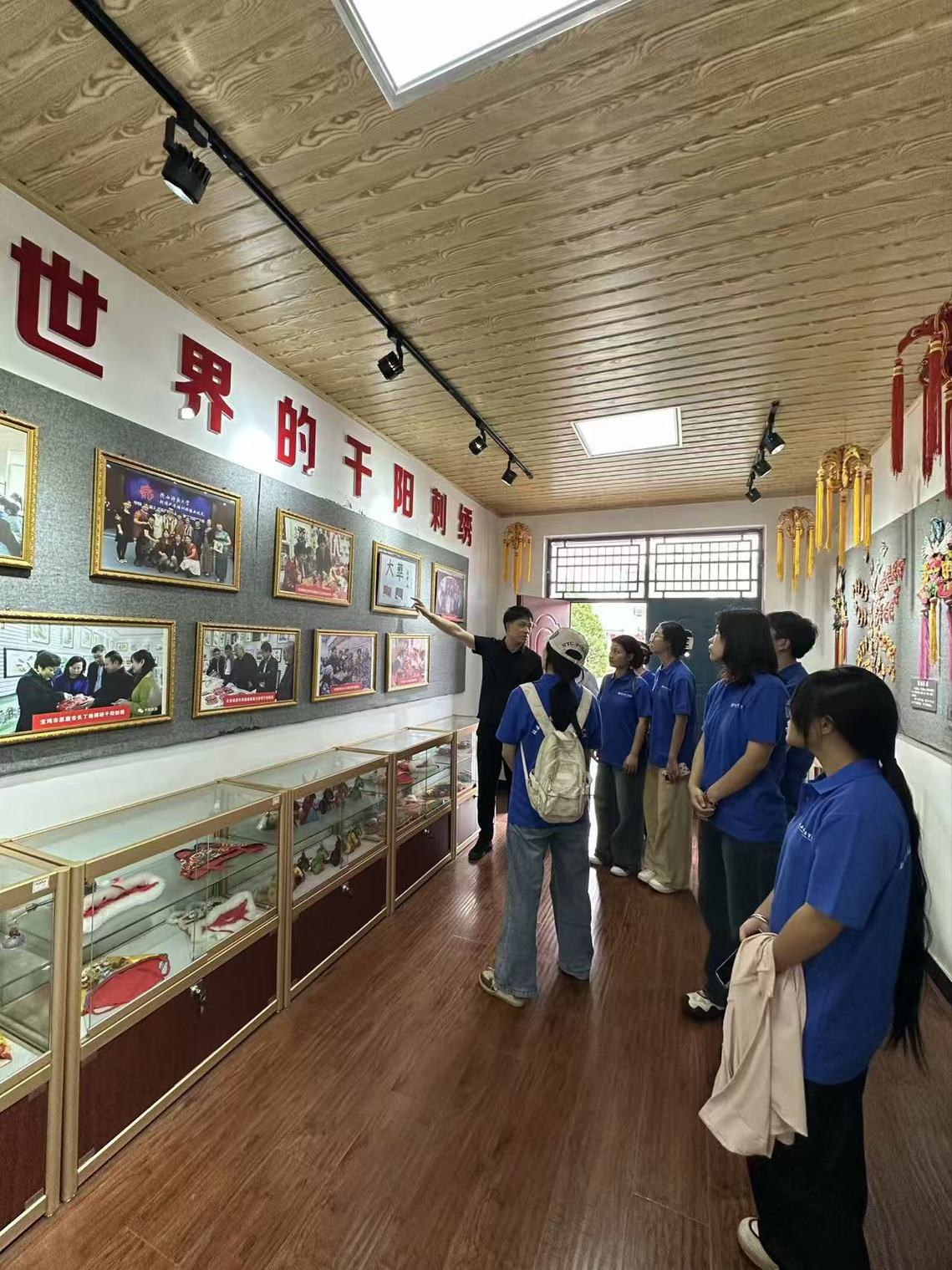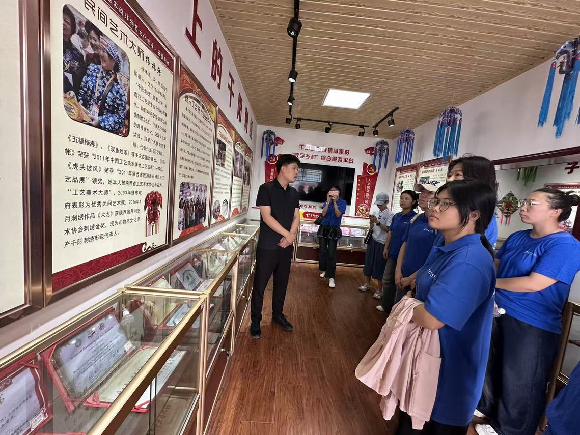 在刘彬书记的带领下,向调研团成员们系统介绍了千阳县闫家村发展历程、千阳刺绣的起源、发展脉络以及在当代的创新传承。重点讲解了千阳西秦刺绣展品特点,每个展厅都从不同角度展现了西秦刺绣的技艺特点、文化内涵和产业发展成果,调研团成员们认真聆听讲解,不时驻足观察精美的刺绣作品,就西秦刺绣技艺传承、图案设计、产业发展等问题与刘彬书记积极交流。大家表示,此次走访不仅加深了对千阳西秦刺绣文化的认识,也为今后的专业学习和实践积累了宝贵素材。让调研团成员们深入了解到这项传统手工艺在乡村振兴背景下的活力与价值。