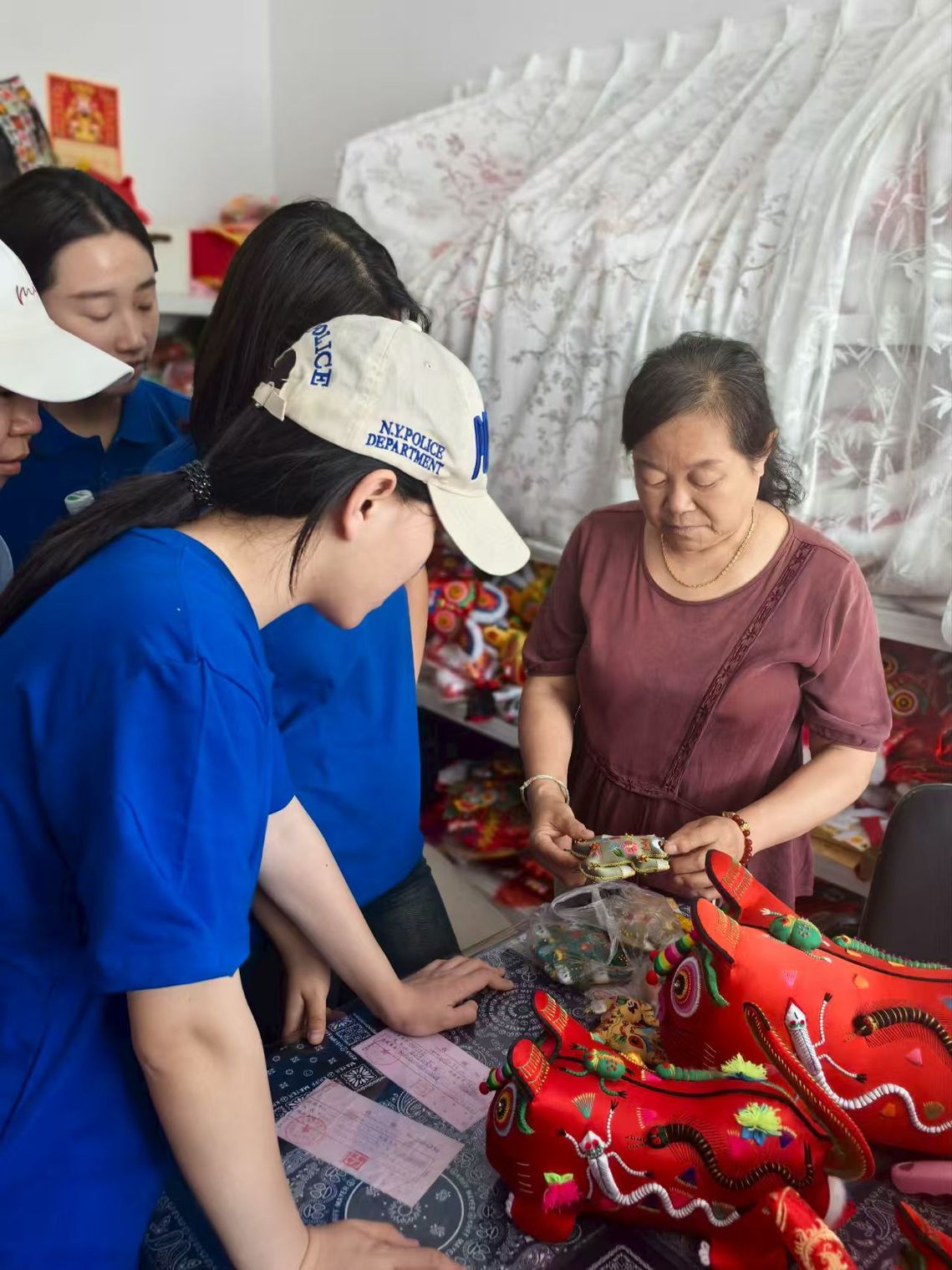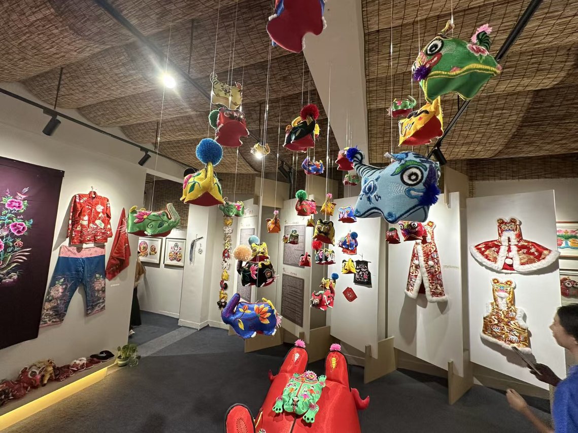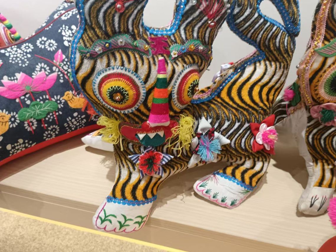 合作社内,西秦刺绣的历史与当下被清晰呈现。根据李老师介绍,不同时代、不同阶级、不同场合的西秦刺绣,有着丰富多样的历史形态——既有抽象风格,也有具象表达,道家元素、清代特色皆囊括其中,每一件作品都是当时绣娘对美好生活的祝愿与时代风貌的映射。如今,西秦刺绣更多以民间艺术的姿态传承,五毒老虎、福禄寿喜等题材,传递着朴素而真挚的情感。