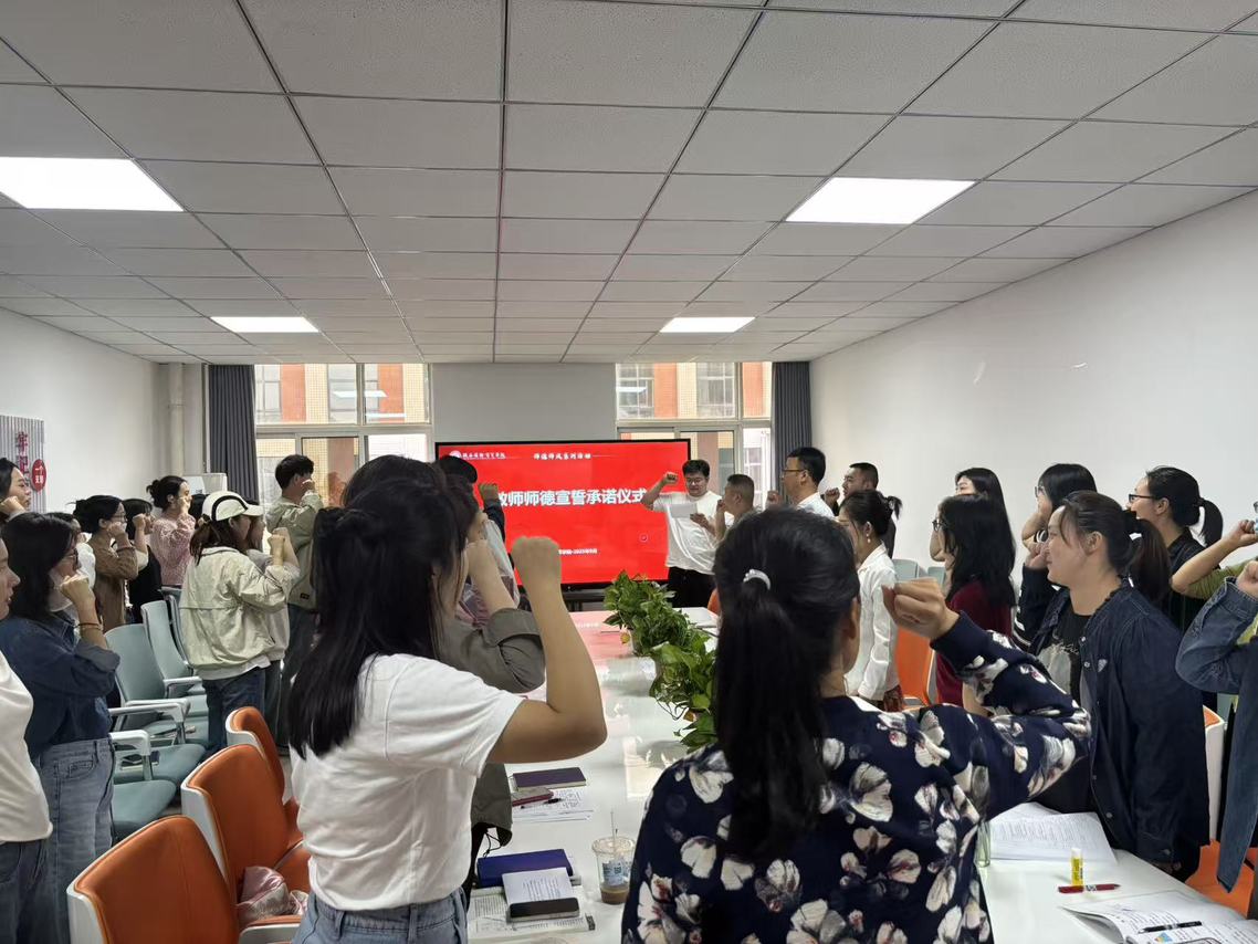 教师代表吴磊带领全体教师进行师德师风宣誓。老师们高举右手,郑重承诺将遵守师德规范,积极履行教师职责。