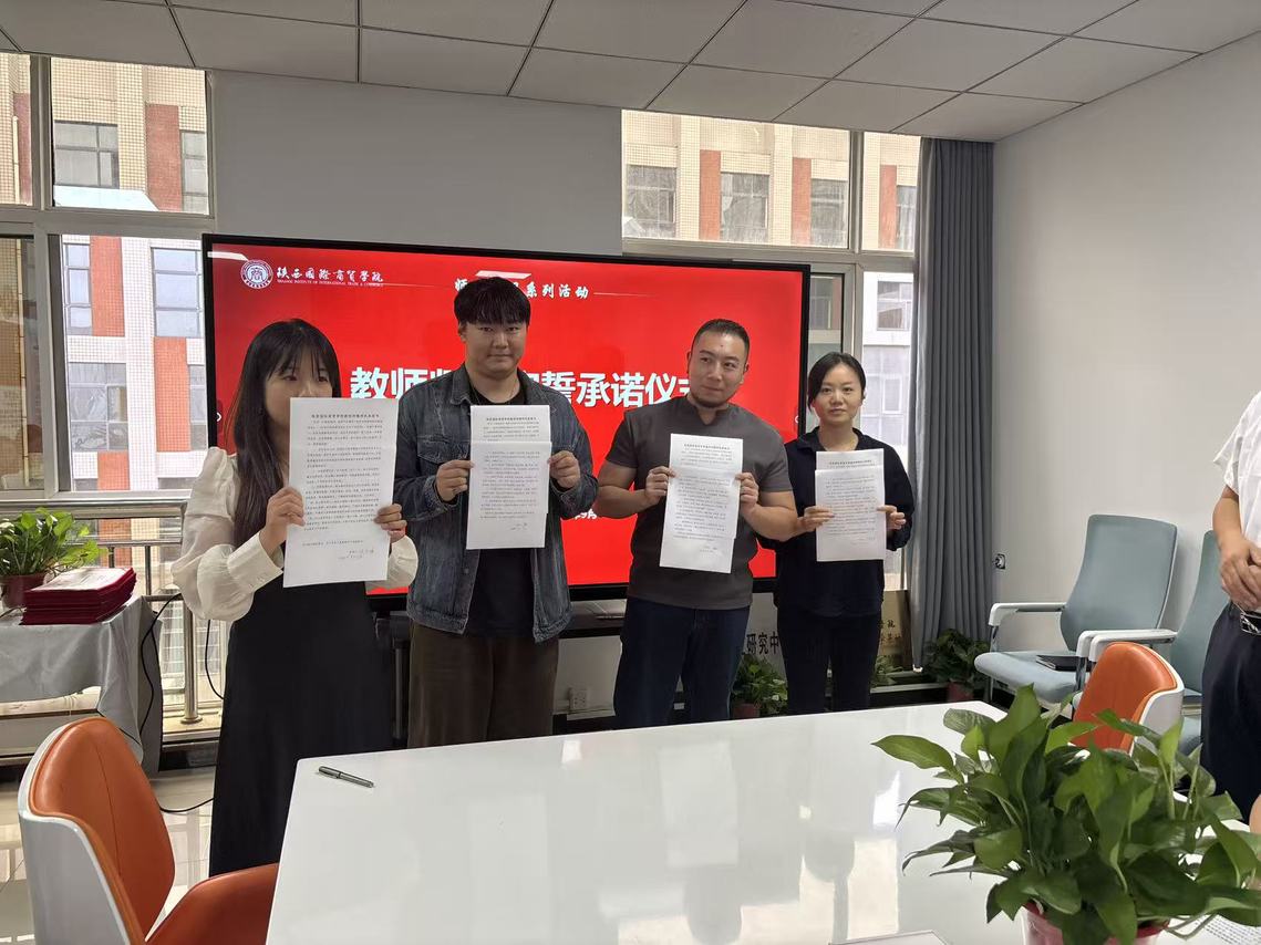 教师代表王逸飞武佳琪何雯夏天签订《QY球友会网站教师师德承诺书》