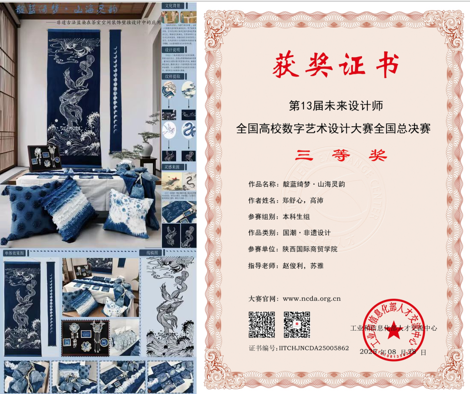 赵俊利、苏雅老师指导学生郑舒心、高沛的作品《靛蓝绮梦・山海灵韵》荣获国赛三等奖